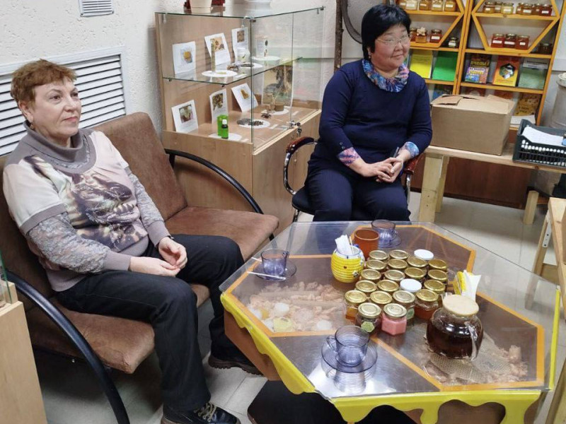 К нам на обзорную экскурсию пришли две посетительницы, находящиеся на лечении в больнице! Узнав о нашем музее, они отпросились у врачей, чтобы ненадолго окунуться в мир пчел и меда, представляете?